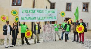 Protijaderní aktivisté a zelení (včetně několika kandidátů pro nadcházející volby) na prvním nádvoří českokrumlovského zámku.